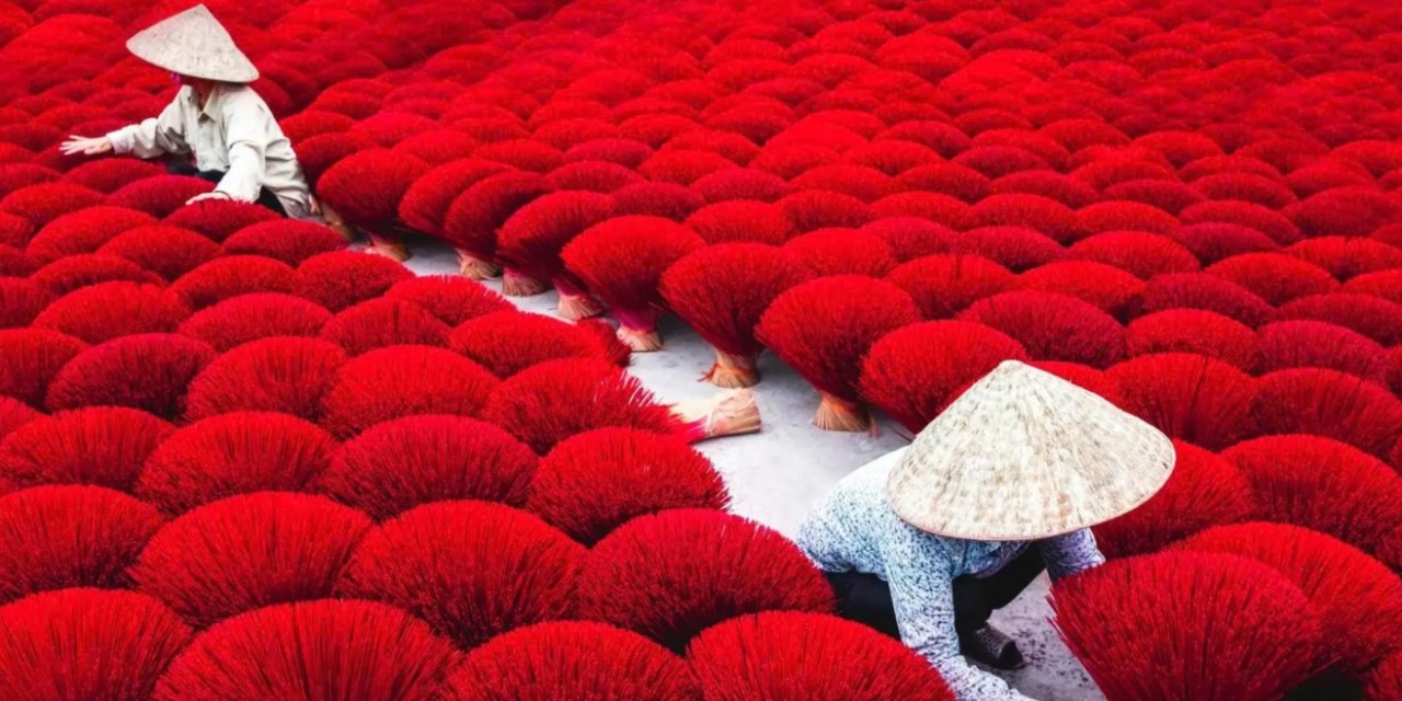 - Ardından yüz yılı aşkın süredir tütsü üreten Quang Phu Cau köyüne doğru yola çıkıyoruz. Köyün merkezine doğru bir yürüyüşe çıkıp yerel halkın zanaat seviyesinde nasıl tütsü yaptığını gözlemliyoruz. Tütsü çubuklarını boyama konusunda uzmanlaşmış bir aileyle tanışıyor ve renkli tütsü demetlerini inceliyoruz.